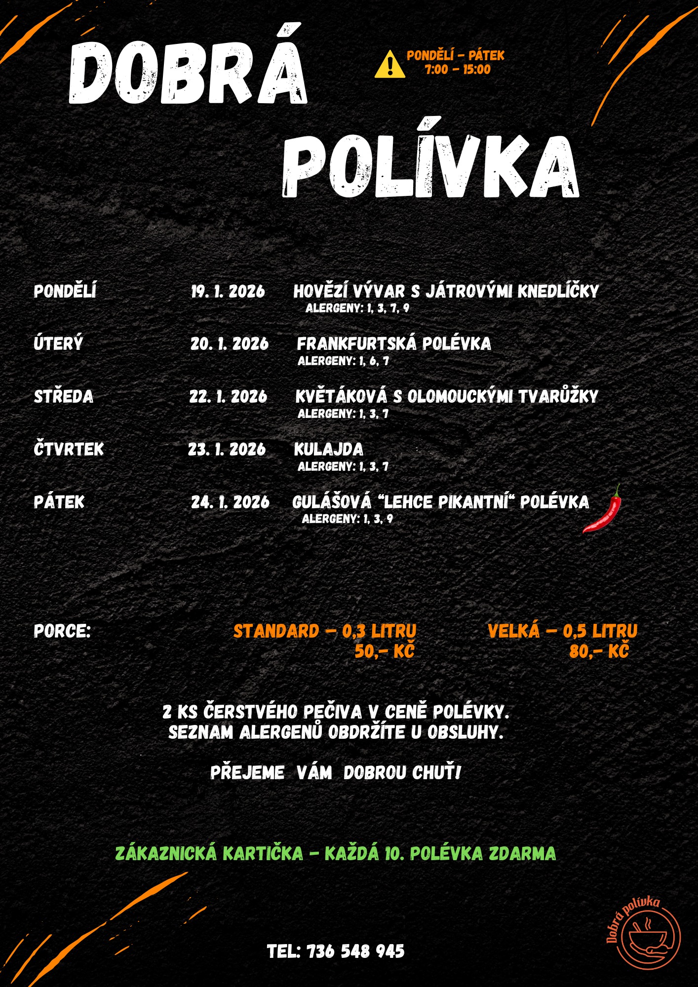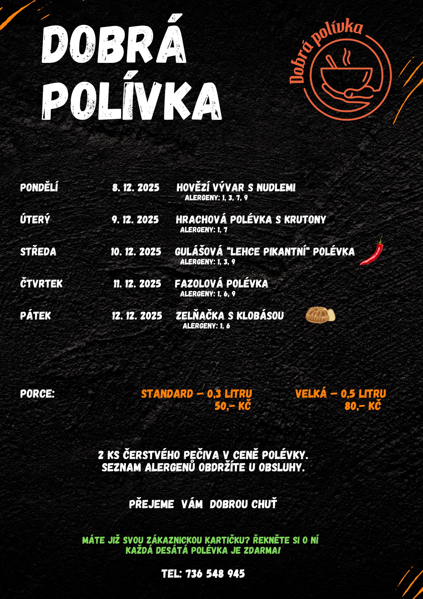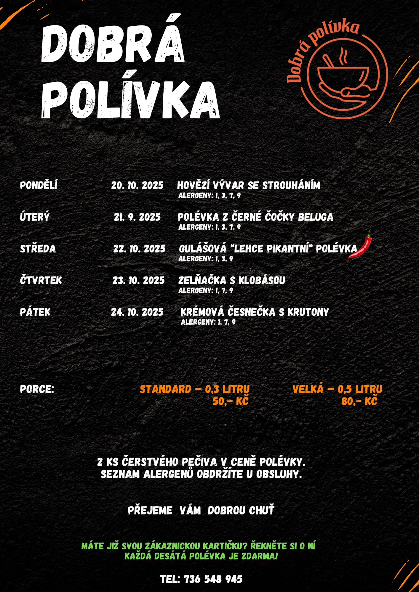 Co u nás najdete: Každý den čerstvé polévky – od vývarů přes krémové i vydatné gulášové až po tradiční české klasiky jako kulajdu, dršťkovou nebo zelňačku.